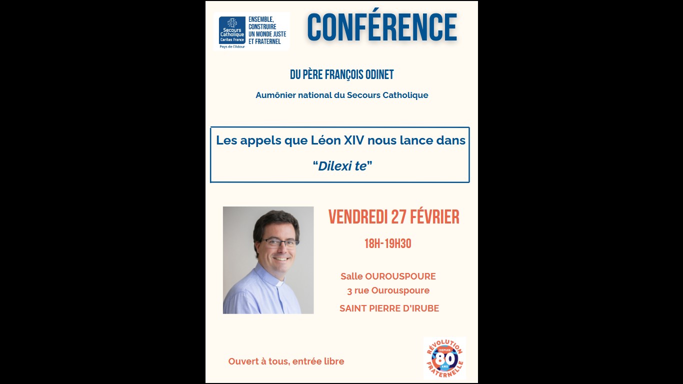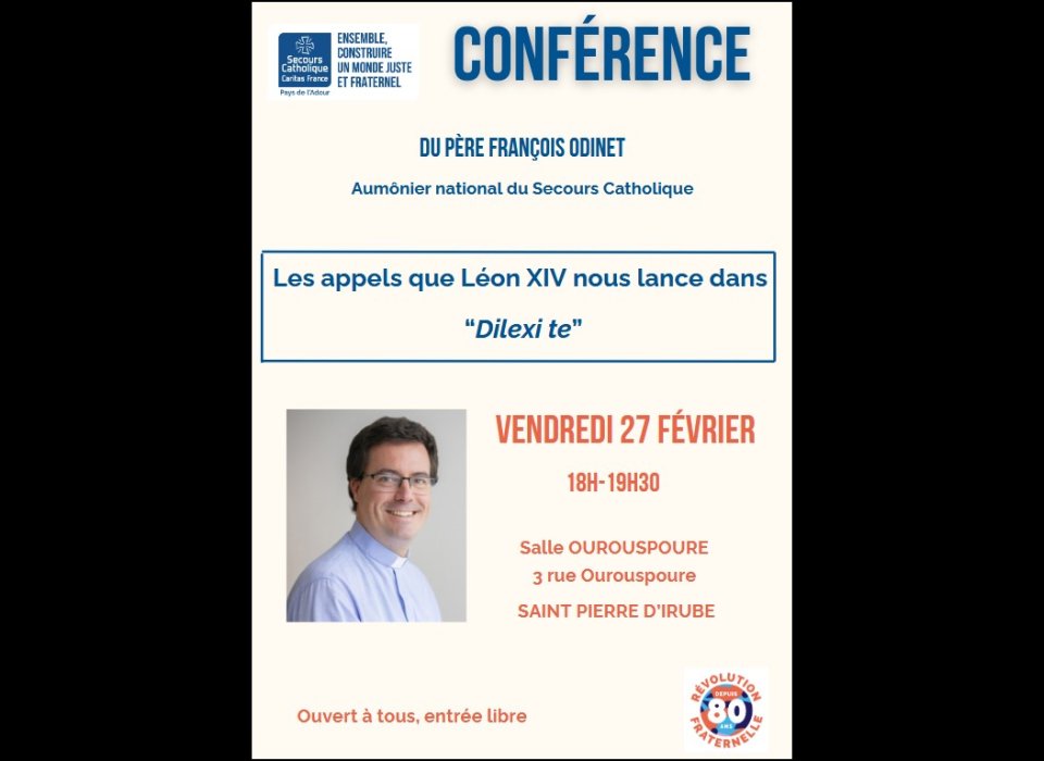 Le vendredi 27 février 2026, à 18h, venez nombreux à la conférence du Père François Odinet, aumônier national du Secours Catholique, à Saint Pierre d'Irube (salle Ourouspoure, 3 rue Ourouspoure)